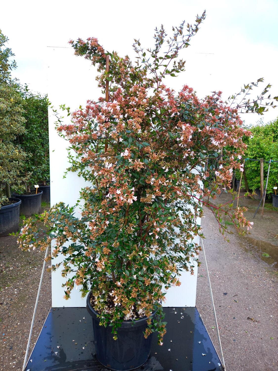 Abelia Grandiflora a profuse and attractive long-flowering shrub prized for its lovely blooms and graceful open-vase habit. This flowering shrub retains its glossy green leaves on arching branches right through the year and is known as semi-evergreen so it offers interest beyond its flowering period. However without doubt, the prettiest feature of Glossy Abelia is certainly its blossoms: Abelia Grandiflora produces profuse trumpet-shaped, pink-tinged, flowers that are fragrant and will keep on flowering all through the summer months. Regular deadheading will help to prolong the flowering period.
