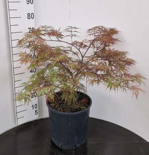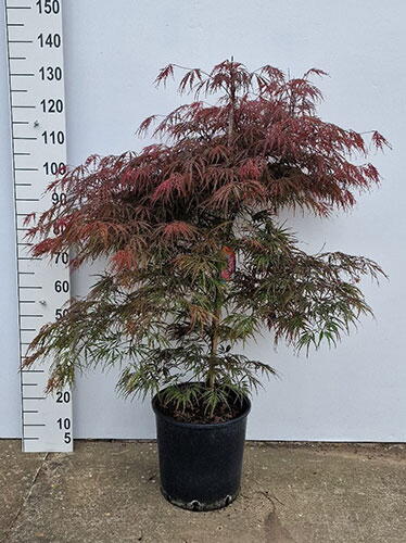 One of the smaller Japanese Maples, it is a stunning tree with red leaves. Forming a dome shaped compact tree with deep cut filigree leaves - starting out purple in the early part of the season and changing to bronze and then shades of orange and red in the autumn.