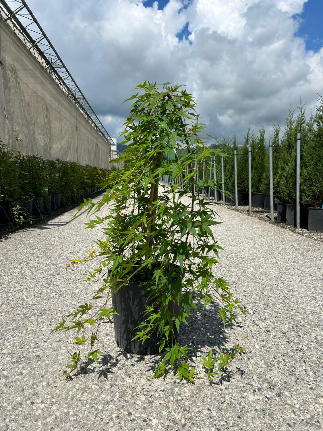 Acer palmatum Ryusen forms a narrow, upright framework from which very slender branches hang vertically, often reaching all the way to the ground and giving the tree a curtain-like shape. The leaves are distinctly palmate and five-lobed, with unusual the spacing of the foliage along the shoots, with individual leaves held apart rather than clustered, allowing the branching pattern to remain visible and giving the plant a delicate, see-through quality. In spring, new leaves open in a clear yellow-green shade, bringing early brightness before gradually becoming a deeper, cleaner green as summer advances. Tiny green flowers appear in spring but are inconspicuous, and they are followed by winged fruits, with red-tinged samaras adding a light ornamental detail as the season progresses. Acer Palmatum Ryusen has excellent autumn colour, often showing a blend of red, yellow, and orange across the canopy. Japanese Maple Ryusen is particularly effective in Japanese-style planting, where its vertical drape can soften stonework or create movement near water, and it also makes an eye-catching contrast beside broader, spreading Japanese maples such as Dissectum types with a flatter outline.