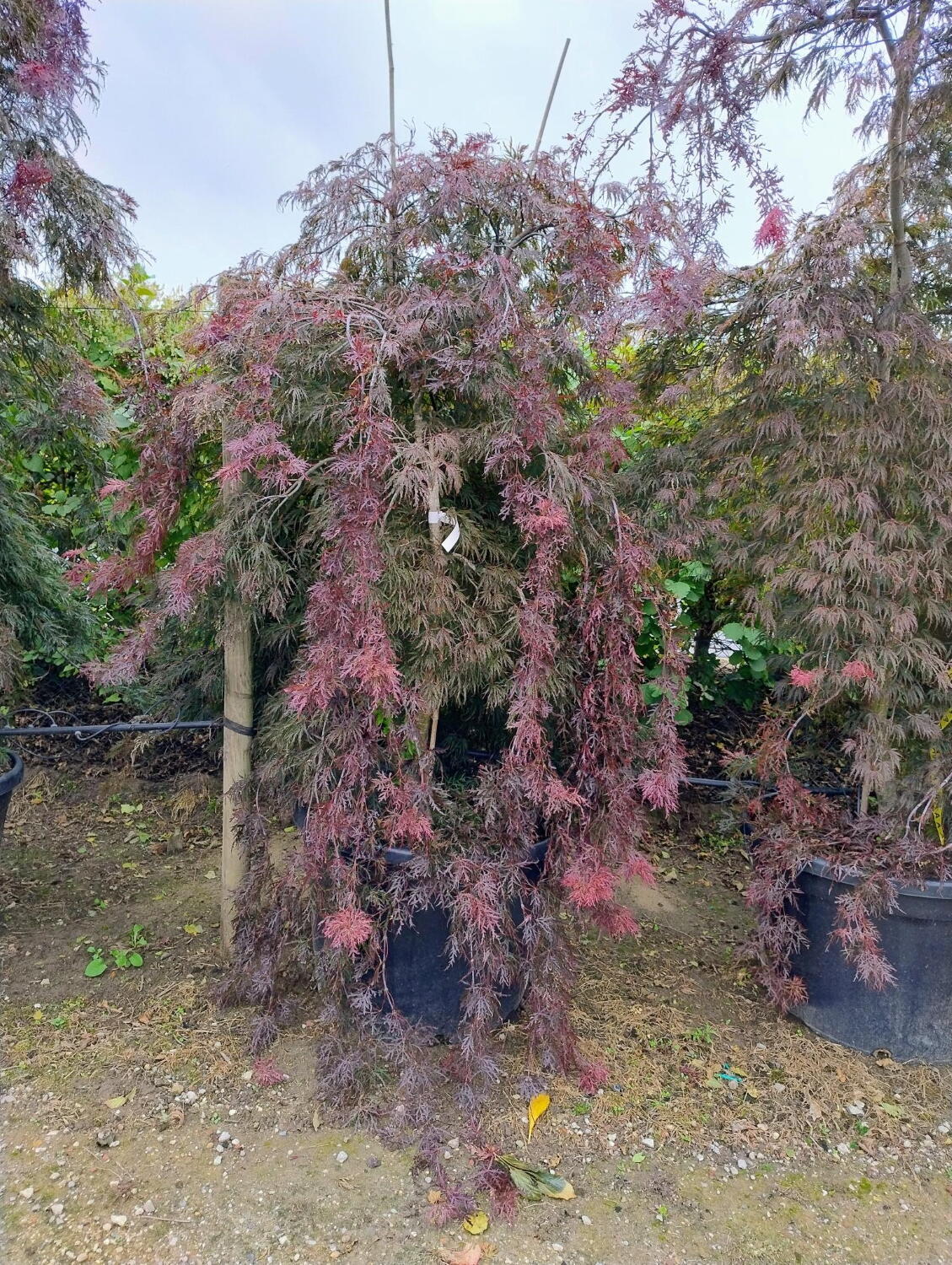Acer Palmatum Dissectum Inaba Shidare, also known as the Japanese Maple Inaba Shidare is a deciduous Japanese Maple tree with lobed leaves and small flowers. The larger leaves produce a tone of deep purple and red in the spring and they keep this colour throughout the growing seasons. The autumn colour is a crimson tone. Inaba Shidare is unique in that it grows in an upright manner, yet still has a cascading appearance. In fact, the word shidare means "cascading".