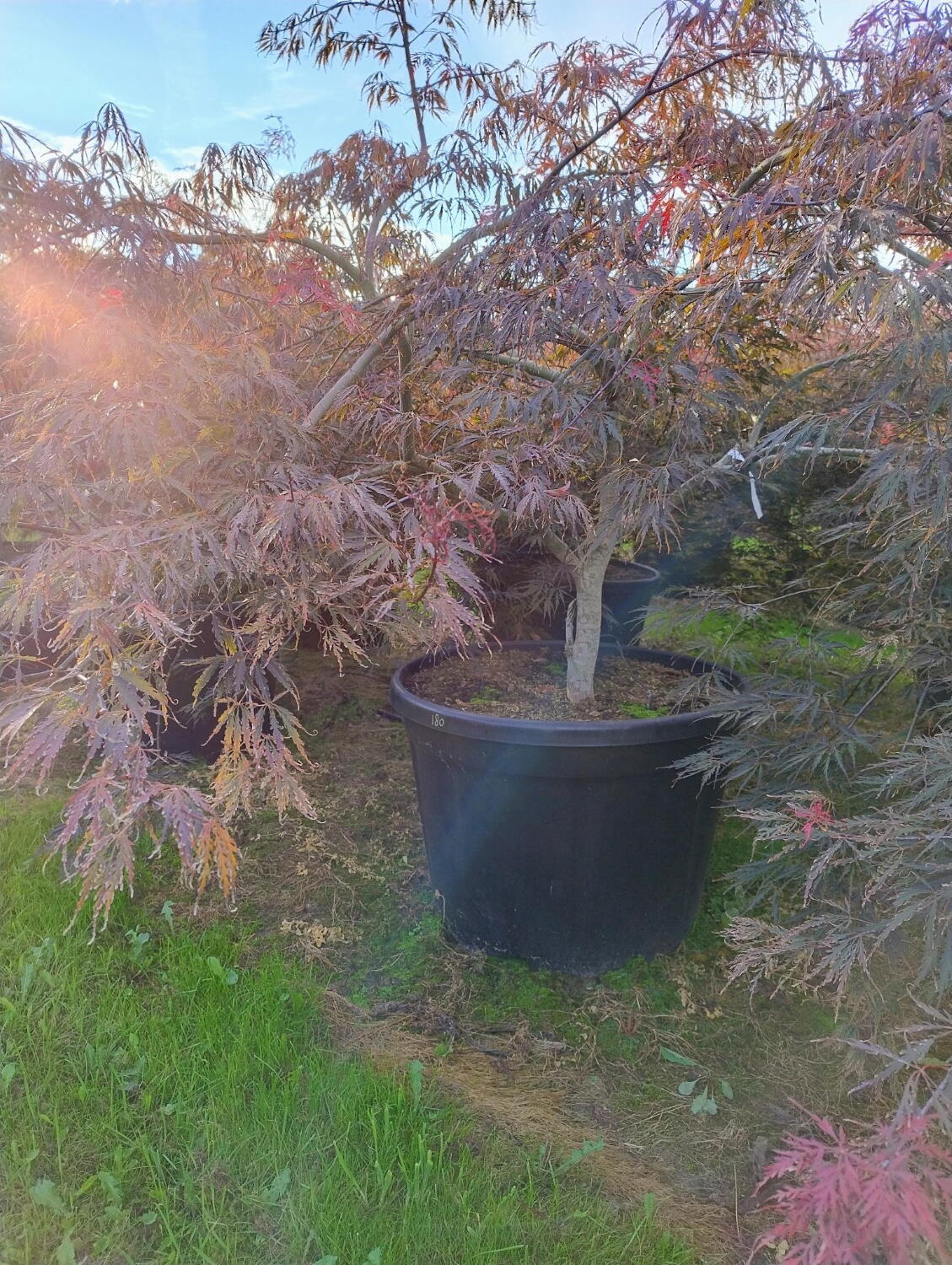Although Acer palmatum Tamuke yama is one of the older varieties of Japanese Acer, it more than holds its own among the newer hybrids because of its ability to keep its rich, deep red colour throughout the summer months. With its large, dissected leaves, these trees can last 50 to 100 years, growing in beauty with every passing year!