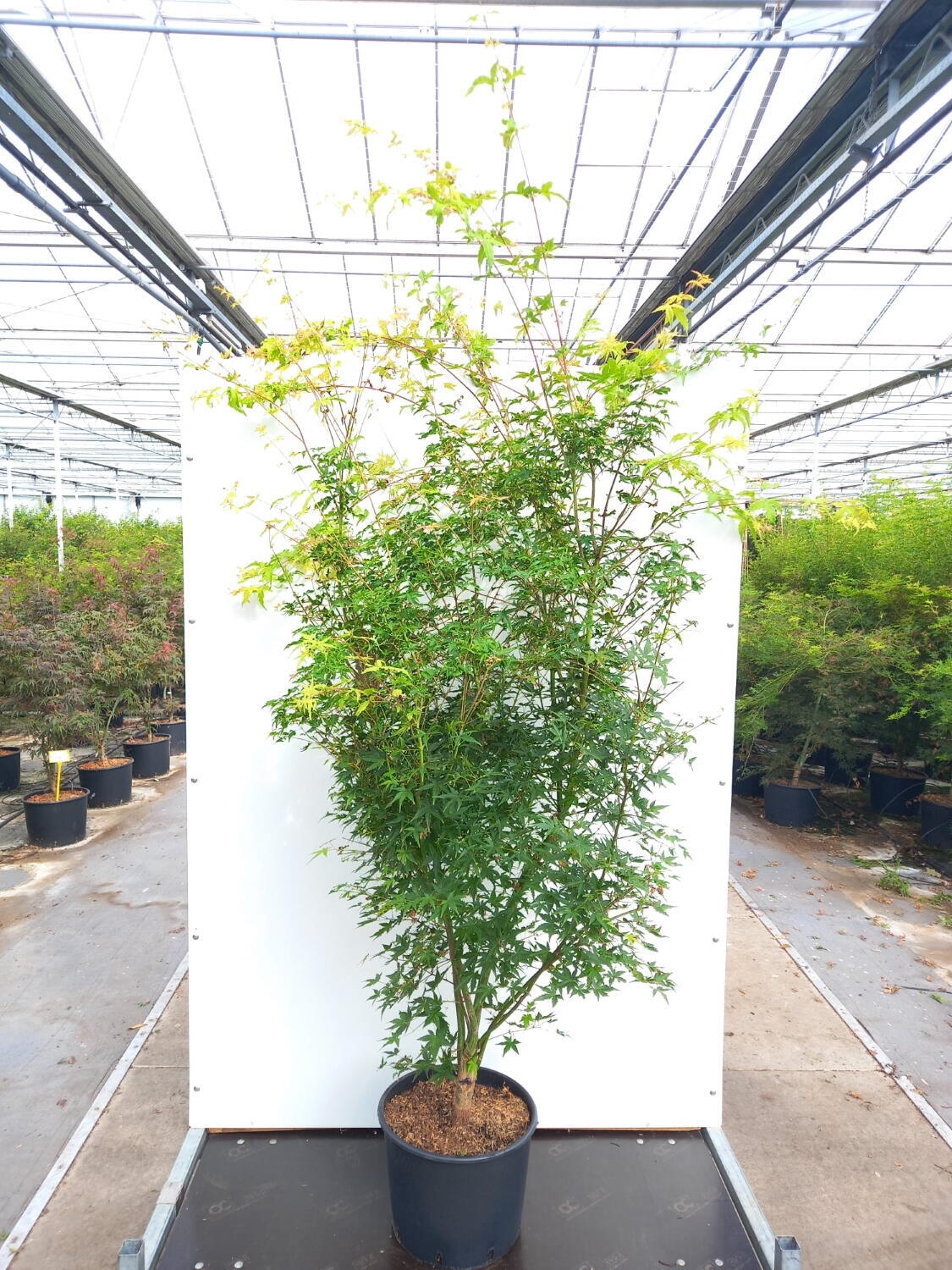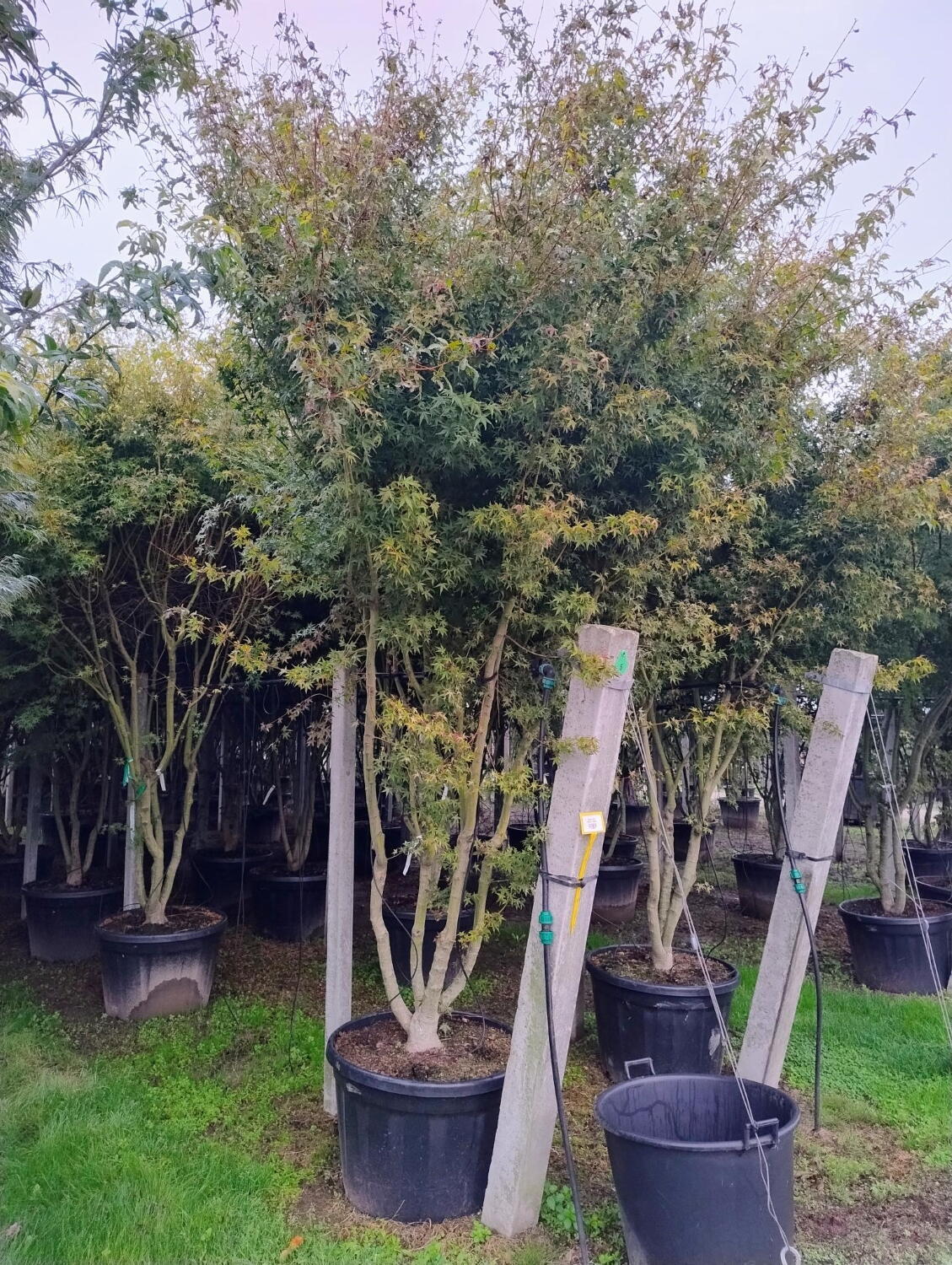 Acer Palmatum Ueno Homare is a compact upright tree that works best as a specimen plant, particularly when positioned so evening sun can light up its spectacular foliage. It also does well in containers, and this gives you the added benefit of moving them to the best evening sun spots, or even next to a pond which will reflect the foliage.