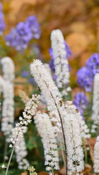 It has brown-purple stems and foliage hence the name brunette, although new foliage is usually green. Its flowers appear on tall spikes in autumn in a flourish of purple buds that open and grow into simple white spears. This is a deeply toned plant that takes you from summer into autumn when the garden is beginning to fade.