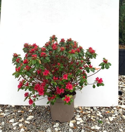 Japanese Azalea Hino Crimson is a low growing evergreen shrub with dark green leaves, beautiful small deep red flowers profusely cover the entire plant in late April through until May. The leaves turn to bronze-red in late winter providing interest in the garden with beautiful coloured foliage at a time when there is little colour around. Azalea Hino Crimson, a beautiful little specimen that works best when planted in groups or within mixed borders, it is also a fabulous patio plant as it will thrive when container grown. Azaleas are slow growing and are perfect for using as a low hedge, especially within a two or three tiered hedge design..