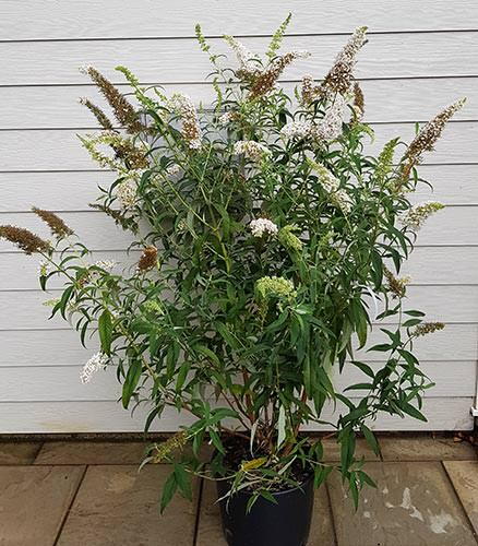 Compared to other Buddleias, Buddleja White Profusion has a rounded bushy shape and will reach a height of about 2 metres. To get the best out of Buddleia White Profusion, it should be cut back to the ground every spring. This will encourage a more vigorous growth and produce more flowers in late summer. As with all Buddleja, White Profusion should be grown in a full sun position for best results. Other merits of the Butterfly Bush in general include its tolerance of poor soils.