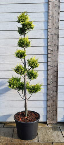 Very easy to grow with low maintenance, Chamaecyparis Lawsoniana Ivonne is often chosen to train as a Niwaki specimen, these trees are very easy to shape and trim, this pom pom topiary tree is circa 2 metres high. Buying a good mature size has the advantage of providing an instant impact in your garden and will keep it's shape with a twice yearly trim.