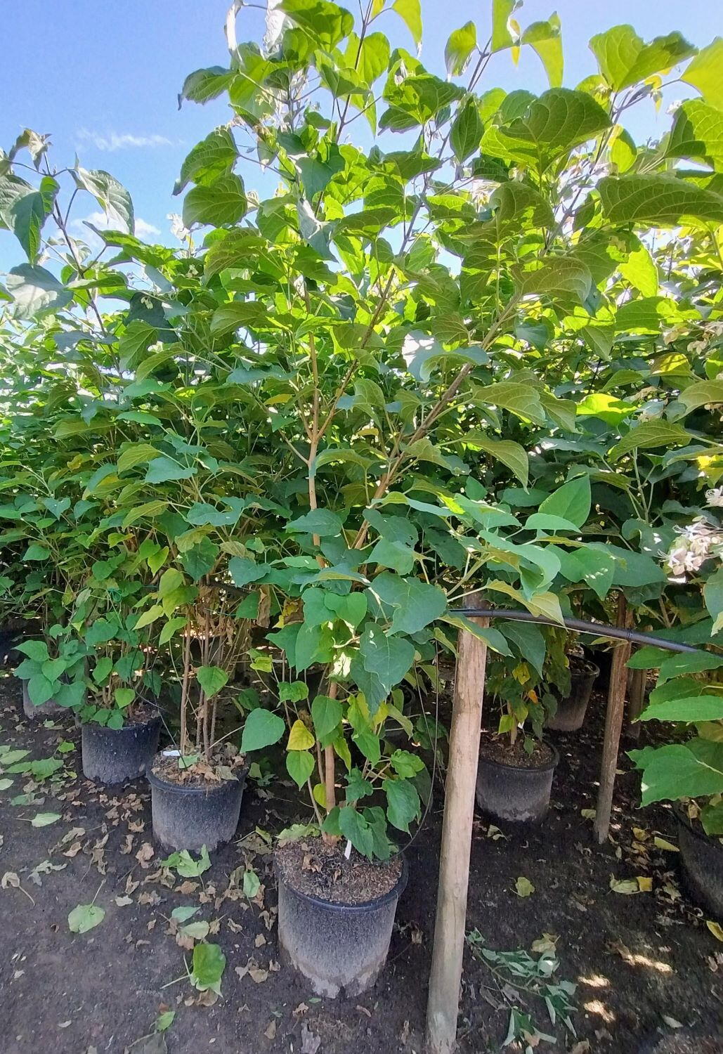 Clerodendrum Trichotomum Purple Blaze is also known as the Glory Tree or Glory Bower. Rare, this deciduous shrub originates from China and Japan. This is an ornamental tree for growing in beds and borders, for the fabulous display it provides in late summer and autumn. Clerodendrum Trichotomum Purple Blaze is a prolific flowerer, a profusion of pink buds burst into pure white star shaped flowers and the highly fragrant blossom racemes are 20cm across. The Glory Tree flowers then develop into cerise coloured star-like calyxes with bright blue berries at the centre. This highly decorative display warrants a specimen shrub location, to properly appreciate its beauty and fragrance.
