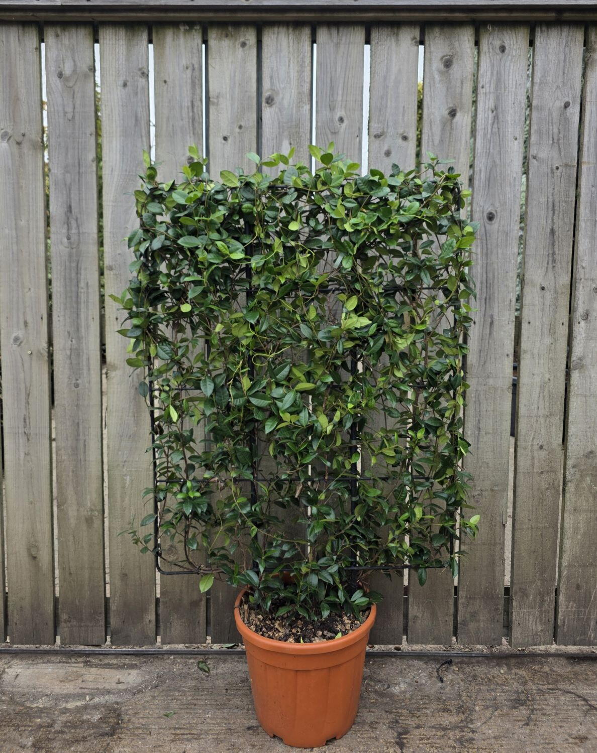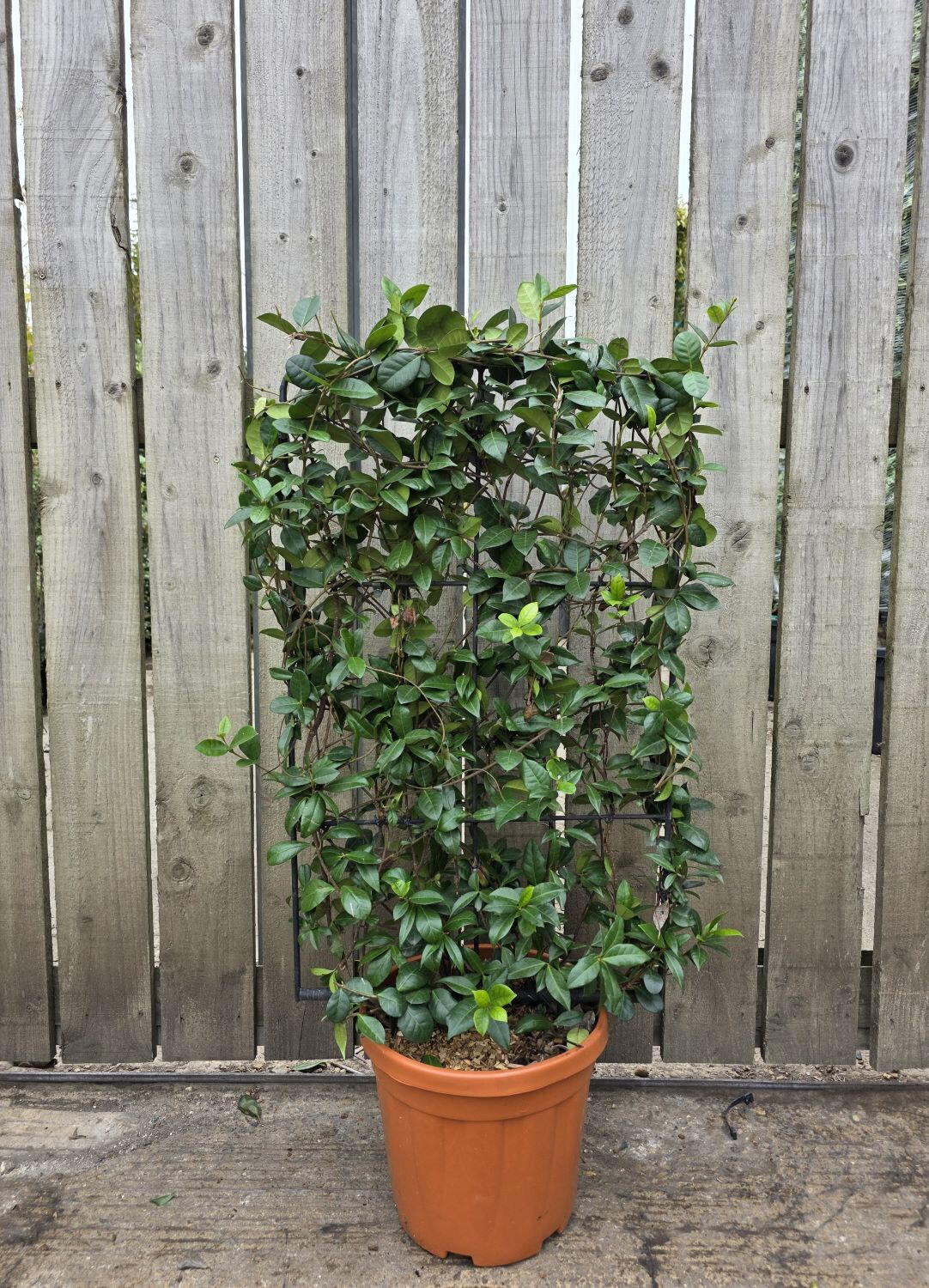 Our evergreen jasmine frame is a fragrant flowering jasmine climber trained on a bamboo screen to create instant bushy evergreen cover. It’s ideal for windbreaks, privacy screening, and greening up a bare fence line.