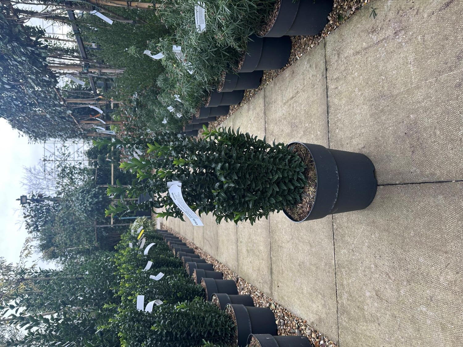 The 'Green Spire' variety is characterized by its narrow, columnar form, making it ideal for spaces where vertical interest is needed without taking up much horizontal space. Its small, leathery leaves are a rich, glossy green, maintaining their vibrant colour throughout the seasons. The foliage is densely packed along upright stems, contributing to its tidy, architectural appearance. Inconspicuous greenish-white flowers may appear in late spring to early summer, occasionally followed by small, pinkish-orange fruits, though the plant is primarily grown for its foliage rather than its blooms or fruit.
