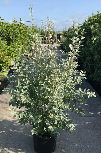 View plant size:Elaeagnus Quicksilver, sometimes known by its alternative name Oleaster Quicksilver, is a variety of hardy deciduous shrub with long silver-scaled leaves and highly fragrant summer flowers. It is one of the largest silver foliage shrubs around and perfect for large mixed borders and exposed sites. Most people choose an Elaeagnus Quicksilver shrub for its glorious foliage. The silvery leaves are touchable and bright in the sunshine. They grow long and tapered forming a pleasing contrast with its June to July blooms. These burst from silvery buds into clusters of small but perfectly formed creamy-yellow flowers. Berries develop from these flowers which are attractive and loved by birds. Oleander Quicksilver’s scent is sweet, fills the air and attracts many pollinators. It’s a great wildlife plant. Elaeagnus Quicksilver ultimate height reaches 2.5 to 4 metres and it will spread over approximately the same distance. When it is left to develop of its own accord, Elaeagnus Quicksilver will form a roughly pyramidal shape.