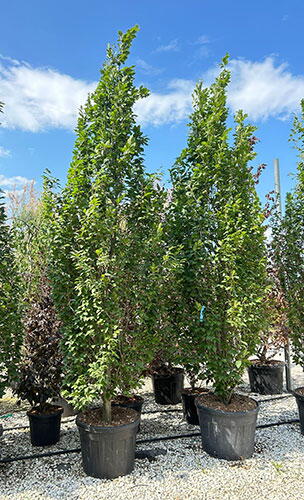 Oriental beech is a columnar, architectural shape that brings instant impact to gardens needing height without spread. Because it’s canopy only reaches six metre wide on a tall single grey trunk, it’s ideal for medium sized gardens.