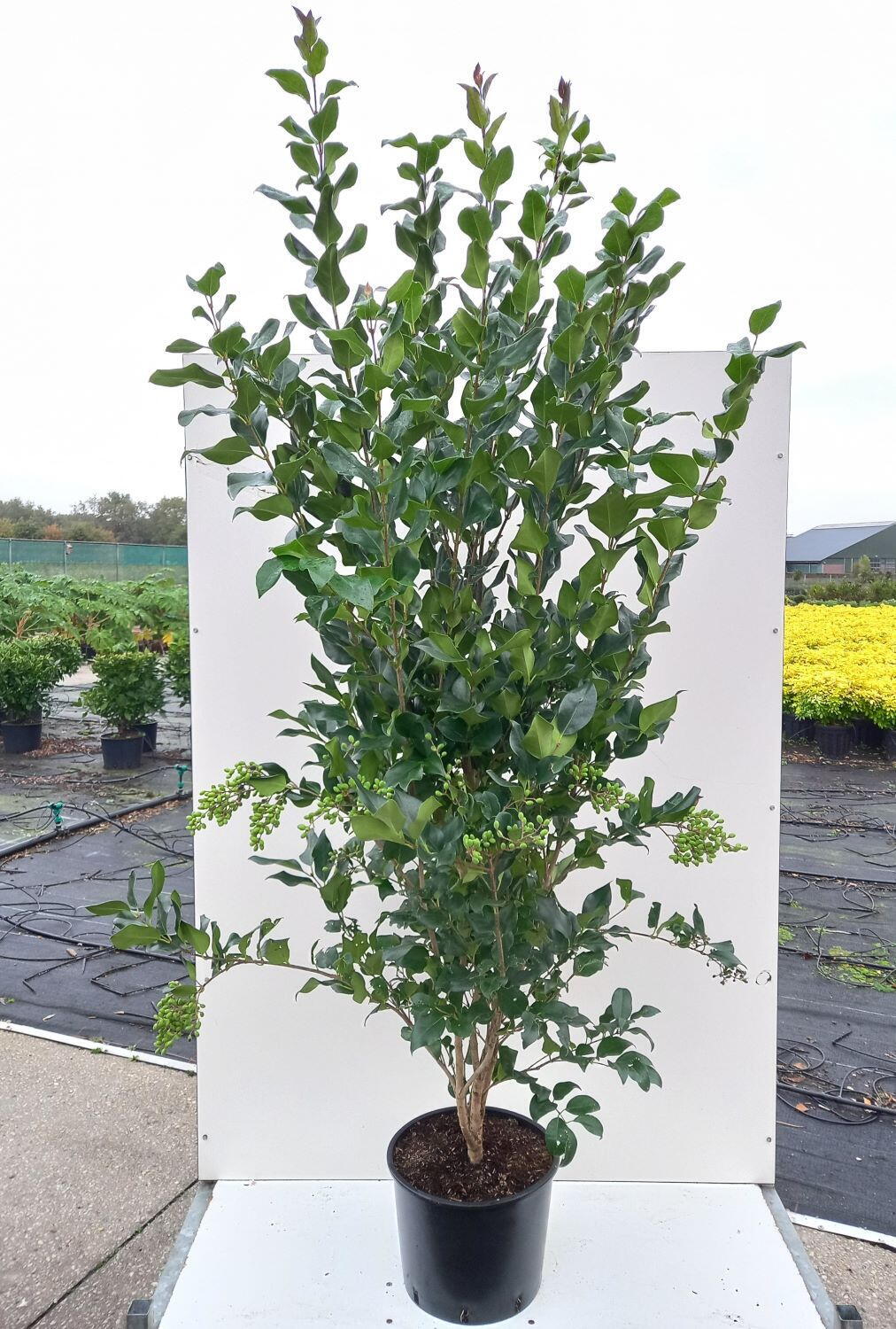 Ligustrum Japonicum Texanum is an upright variety of Japanese Privet that’s perfect for hedging. It’s also known as Waxleaf Privet. Discovered in Texas, USA hence its name ‘Texanum’, this Japanese Privet is a large-leaved compact variety with an upright growth habit. The oval leaves are waxy with a dark green surface and whiter underside. In late spring fragrant white flowers appear in pretty panicles that attract pollinators and mature into small black fruits during summer. Japanese Privet Texanum can be grown as a standard tree shape but due to their dense upright branches, they also create excellent thick hedges, windbreaks, and privacy screens.