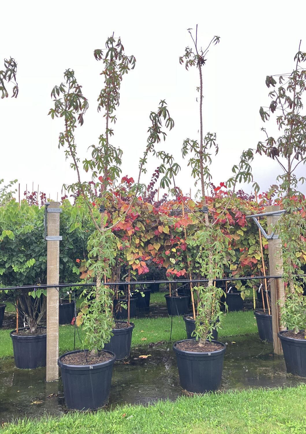 Kalopanax Septemlobus are small to mid-sized trees from Japan with some resemblance to Japanese Acers. This variety Maximowiczii is a small ornamental deciduous tree with good autumn colour and large flat heads of pollinator-friendly white flowers. It suits mixed borders and low-maintenance gardens.