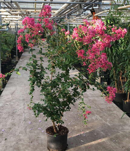 Lagerstroemia Indiya Charms Fuchsia d’été (Summer Fuchsia) is a deciduous early flowering intensely pink crape myrtle from the new Indiya Charms collection. It’s been specially bred to suit a Northern European climate. Crape Myrtle gets its common name from the crinkled petals that resemble crape paper. Fuchsia d’été’s pretty pink flowers start appearing in June, about a month before traditional crepe myrtles bloom. The bright flowers hang in medium-sized panicles packed with individual flowerheads that pollinators love.
