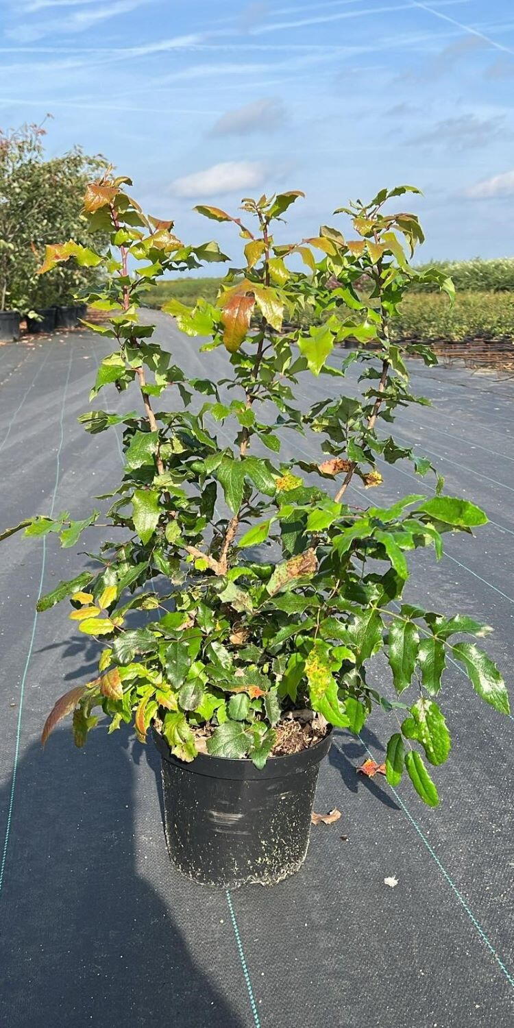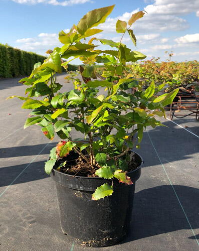 Native to the Pacific Northwest, Mahonia Aquifolium was first brought to the UK in 1823, and has been a favourite of gardeners here ever since. Its evergreen leaves, similar to those of the holly plant, are red-tinted when they emerge in the spring, changing to a glossy deep green in summer, then purple in the autumn, and finally burgundy tinged with bronze in winter. In the winter to early spring, the plants are covered with clusters of fragrant yellow flowers. The blue-black berries which follow later in the year can be made into jams, jellies or wine. To ensure a good set of fruit, plant more than one Mahonia Aquifolium bush for cross-pollination.