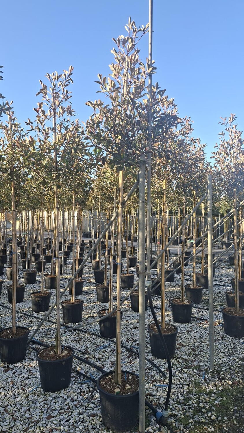 Photinia Fraseri Pink Marble is an eye-catching evergreen beauty. These trees have been grown and shaped as full standard trees. Standard Trees are a form of topiary where trees are trained to grow long clear stems with a mop of foliage on top. This formal standard shape makes a dramatic singular garden specimen or it can be grown side by side to create a privacy screen utilizing pleaching or a stilted hedge method. It also forms a successful espaliered-style hedge against a wall or fence. A variation of the Photinia Red Robin, Photinia Pink Marble was awarded the prestigious RHS AGM award.