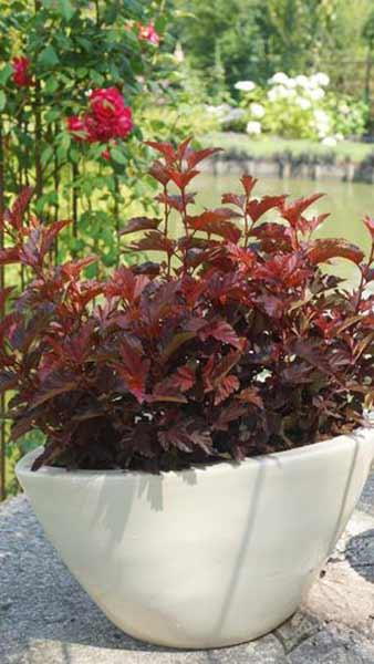 Ninebark Little Angel will grow in a well-watered and fed plant pot or container on a sunny balcony garden or a patio and brings extra interest to the front garden.