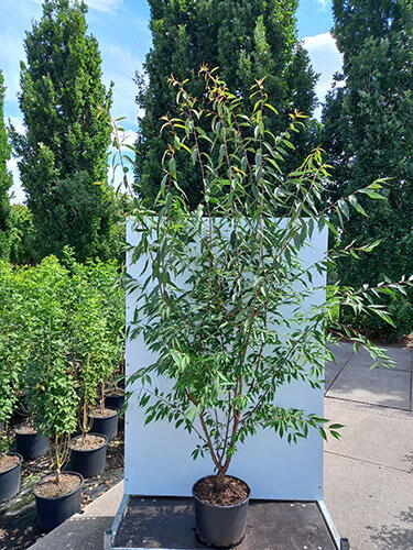 In April it produces small white blooms which bud mid-pink and burst into bowl-shaped white stars with yellow whiskery stamen loved by pollinators. The flowers measure 2cms in width and grow in clusters than can cover the entire canopy. Foliage arrives with the blooms in narrow, willowy fingers of mid green which contrast nicely with its deeply polished mahogany-like bark. The summer months mean a rounded head of green pointed leaves and small red oval fruits that birds adore. In autumn the narrow leaves turn a buttery yellow before falling with the frosts.