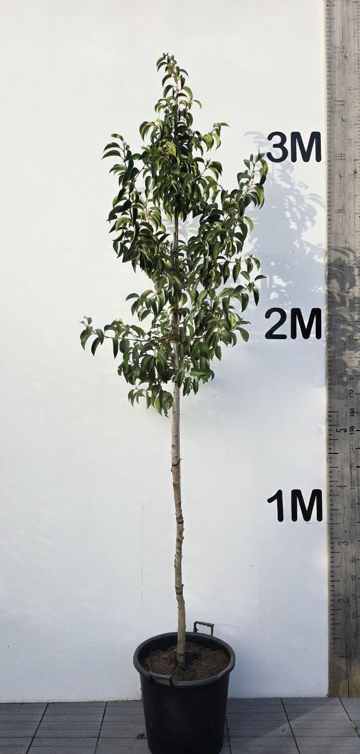 Fragrant white flowers on pendant racemes appear in early summer around June to July, followed by red cherry shaped fruit ripening to black. In terms of maximum height of Prunus Lusitanica Angustifolia as a full standard tree (estimated to be 6-8m), you should note that the stem height will not change significantly. It is the the head (shrub part of tree) that will get larger. This can be pruned to shape or height desired.