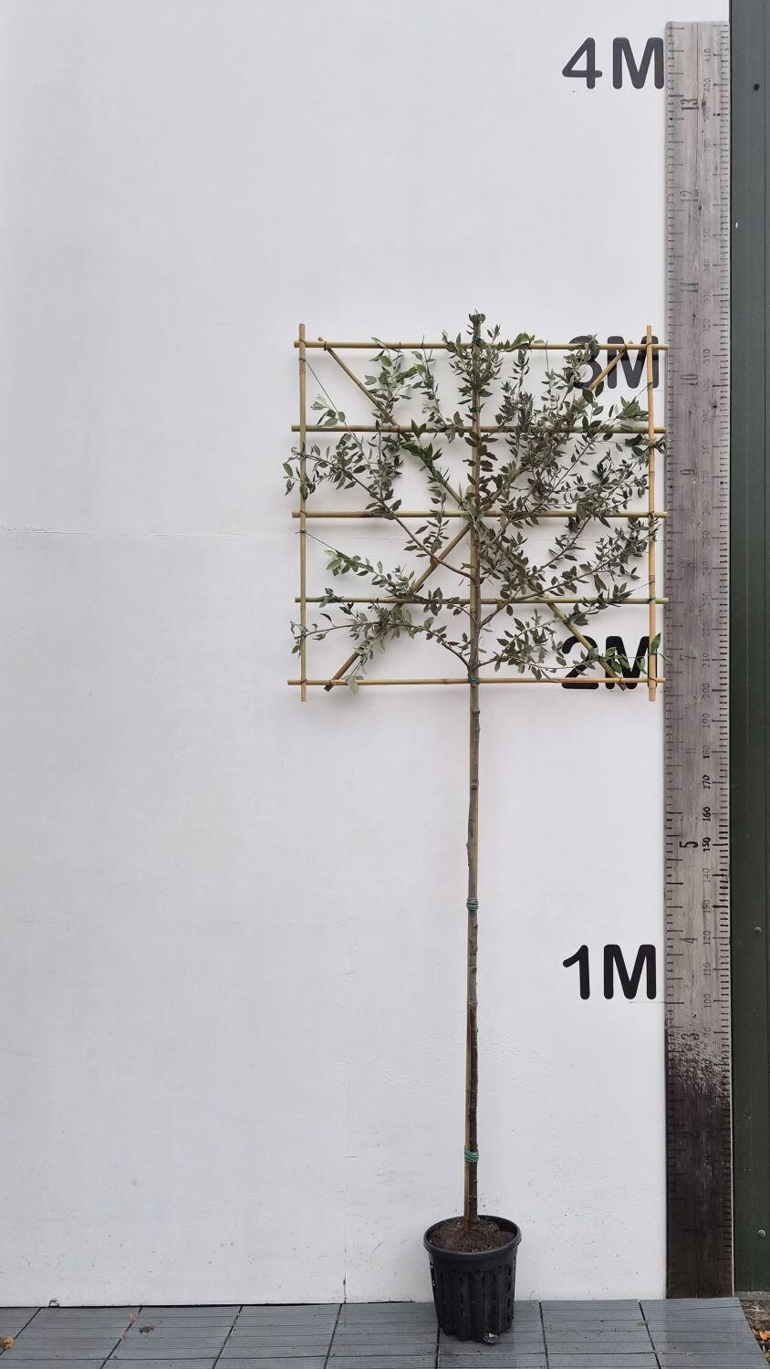 Pleached Trees are full standard trees on a clear stem of at least 1.8 metres tall from the base to the start of the crown. The branches are trained generally along a bamboo frame in flat rectangular shapes.The Holly Oak or the Holm Oak is a native to the Eastern Mediterranean. A naturalised oak in the UK it was introduced sometime in the 1500's and is one of the very few evergreen oak trees found in Britain today. Holm Oak lends itself well to shaping - the shrub/bushy part of the tree is reasonably fast growing (the stem stays the same height). This full standard form is easily kept in shape with an occasional trim. Quercus Ilex Pleach Tree is a large specimen tree with dark glossy silvery green leaves and a darker trunk or stem.