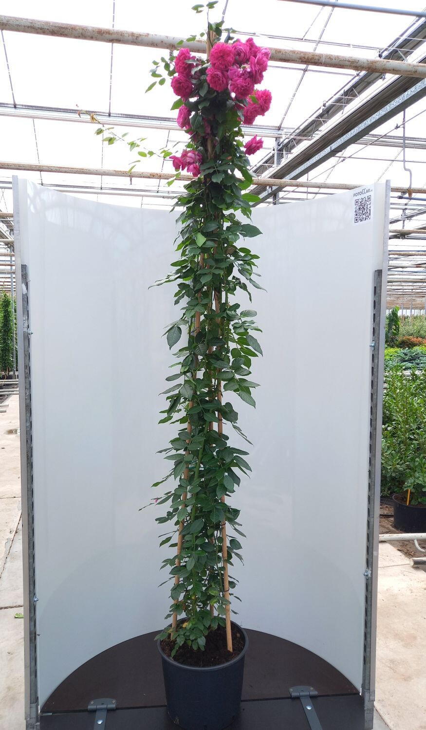Rosa Laguna grows as a vigorous climbing rose with long, flexible stems that are easy to guide and tie in as the plant develops. The double flowers open in a bold deep pink-red shade that holds its colour well in bright light, giving a richly traditional look with a modern repeat-flowering habit. Each bloom carries a notably strong fragrance, making Rose Laguna particularly valuable when planted where the scent can drift across a seating area or be enjoyed as you pass by. Through spring, the plant builds healthy leafy growth, then produces its first flush of flowers in early summer, often continuing to bloom in successive waves into late summer and early autumn with regular deadheading. The foliage is typically glossy and fresh green, providing an attractive backdrop that highlights the intense colouring of the blooms. Rosa Laguna works especially well in garden schemes where scent is a priority, and it can be combined with soft-toned planting that echoes its colour while allowing the flowers to remain the star of the show. For companion planting, Rose Laguna looks beautiful alongside lavender and salvia, which help soften the base and encourage pollinators without competing for attention.