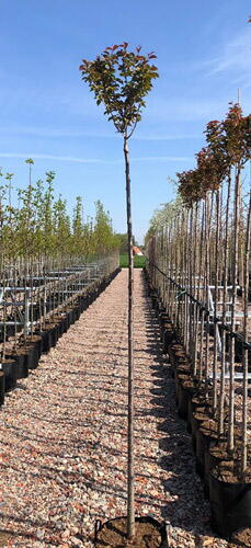 Prunus Spire also called the Cherry Spire, is a deciduous ornamental cherry tree. It is a hybrid cross between Sargent’s Cherry and Yoshino Cherry. The cultivar was created by Hilliers nursery located in Hampshire and is synonymous with Prunus Hillieri Spire. It was originally designed to be an optimum street tree and in deed is considered one of the best small street trees of the 20th century. These specimens are a full standard shape on a long clear single stem.