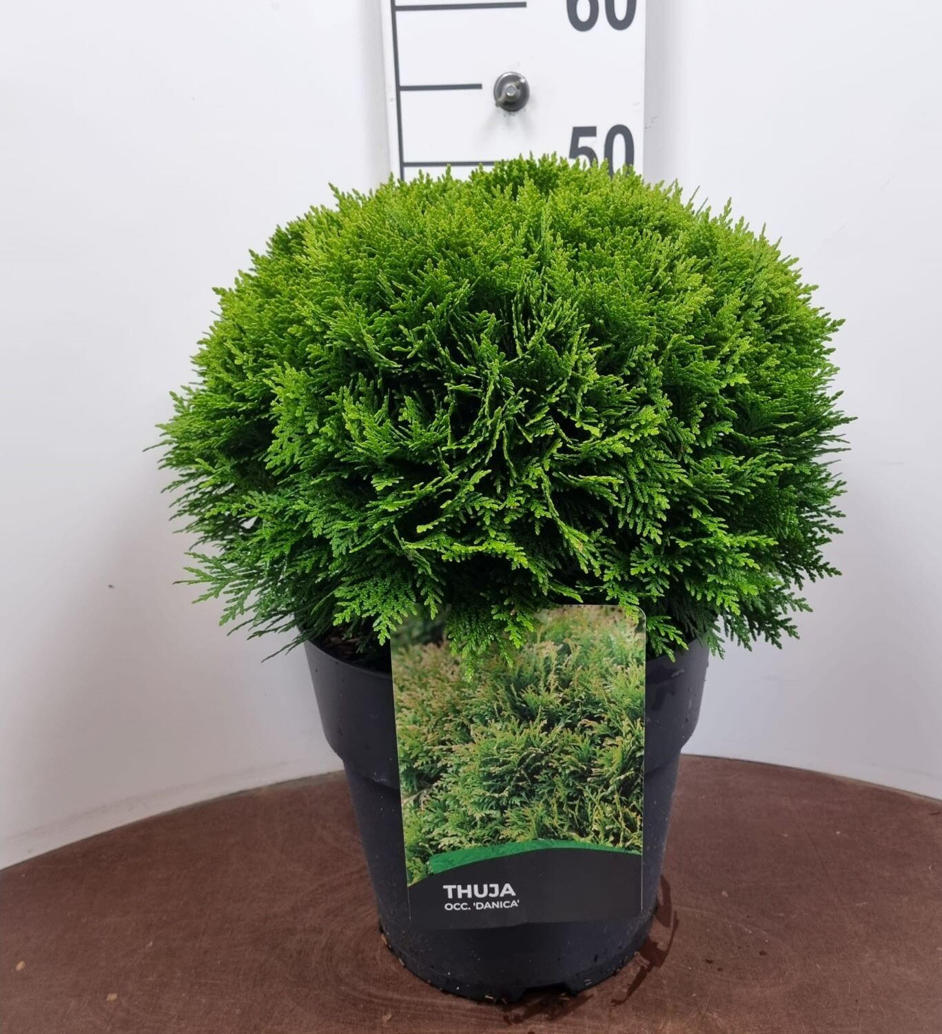 This beautiful dwarf conifer, Thuja Occidentalis Danica (or White cedar Danica) has vibrant emerald green foliage during the summer months. The leaves are arranged so that this plant naturally forms a lovely globe shape.