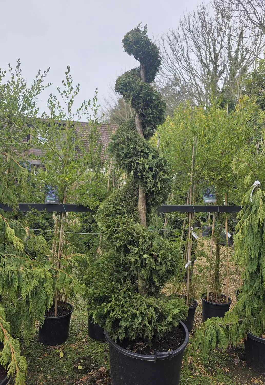 Thuja Occidentalis Smaragd is a very attractive variety of Thuja. Growing slowly and evergreen, this beautiful conifer specimen has been clipped and shaped into a topiary spiral. Thuja Occidentalis Smaragd has erect sprays of bright green foliage which it retains all year, even in winter. The foliage is highly aromatic, producing a lovely citrussy fragrance when brushed against.