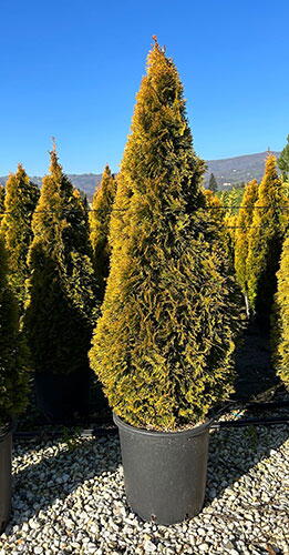 Thuja Occidentalis Golden Smaragd is a dense, evergreen conifer with golden yellow needles. It’s a golden version of the popular hedging conifer Thuja Occidentalis Smaragd and equally suits a tall but low maintenance hedge or evergreen privacy screen.