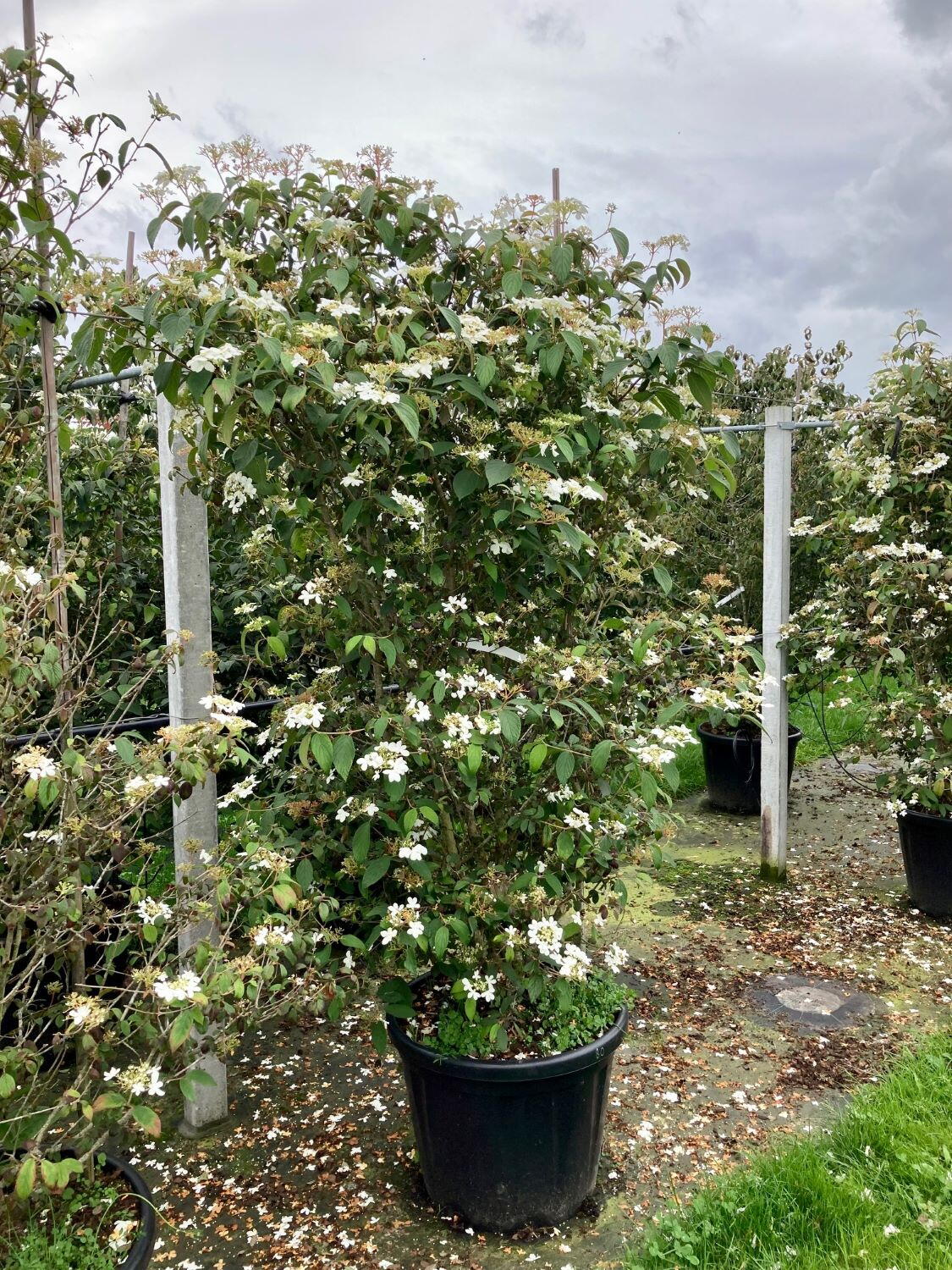Japanese Snowball Watanabe is a good choice for the back of a border where it covers a fence or wall and provides a flowering backdrop for shorter flowering shrubs matching particularly well with other plicatum varieties such as Viburnum Plicatum Popcorn.